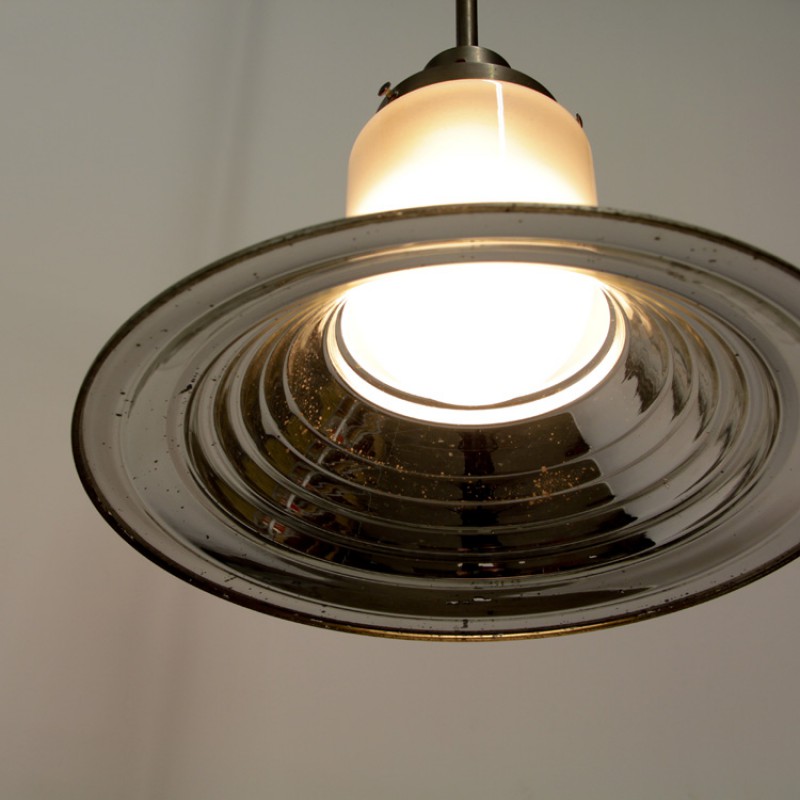 Bijzondere industriële fabriekslamp van Jenaer Astax. De lamp komt uit Duitsland en is in de jaren 1920/1930 gemaakt. De messing arm heeft een prachtig warm patina gekregen door de jaren heen. De kap is van glas en is in een art-deco stijl gevormd.