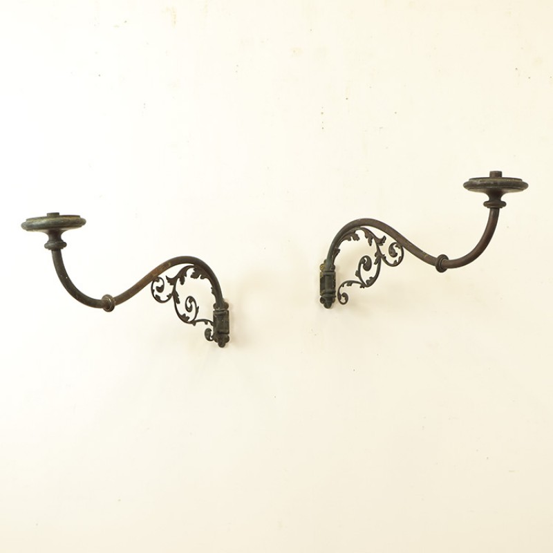 Stel antieke wandkandelaren afkomstig uit een kerk. Grote exemplaren welke van messing/koper zijn vervaardigd. De kandelaren zijn versierd met acanthusbladeren en hebben door de jaren heen een prachtig patina gekregen. De kandelaren kunnen naar links en rechts draaien, De datering ligt in het begin van de 20e eeuw. Prijs is voor de set.