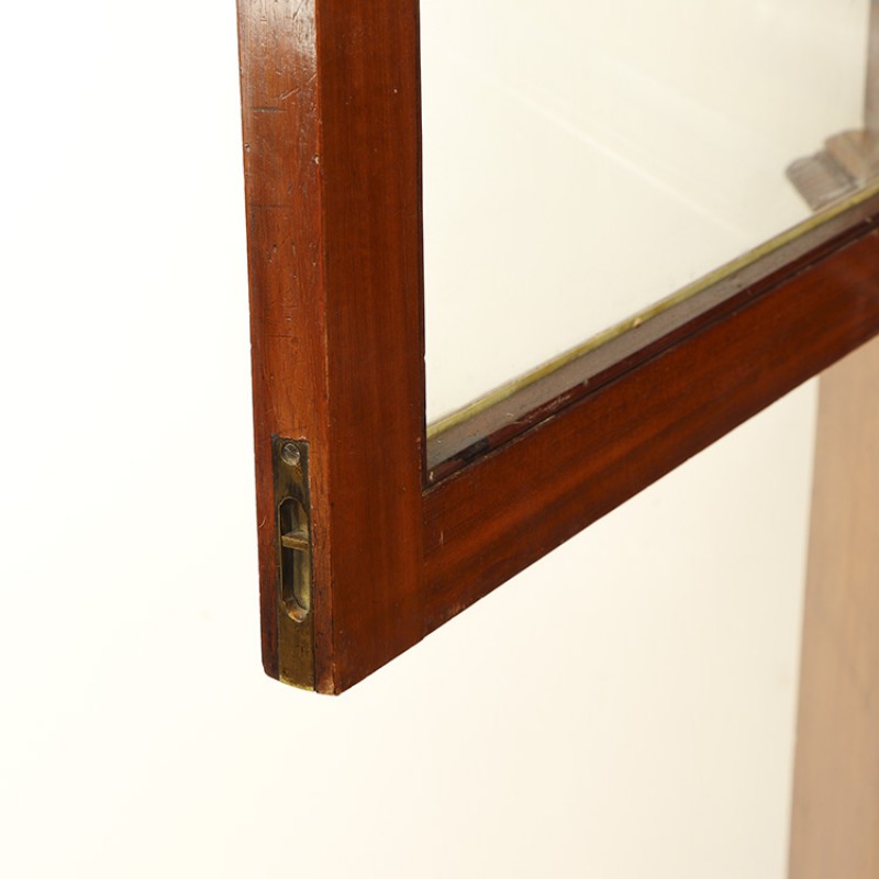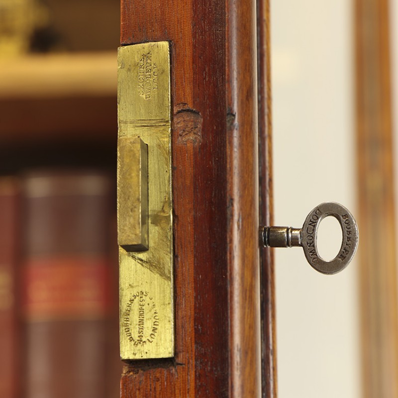 Buitengewone hoge maar smalle boekenkast uit de Victoriaanse periode (1870). De kast is van massief mahoniehout (zijpanelen) en fineer (front) vervaardigd. De kast bestaat uit twee delen en heeft aan de bovenzijde een decoratief vitrine gedeelte met daaronder een zeer praktische onderkast met vier ruime laden. Het geheel verkeert in een nette, licht gebruikte staat met enkele sporen van ouderdom. De legplanken zijn vervangen, de dragers zijn nog origineel.