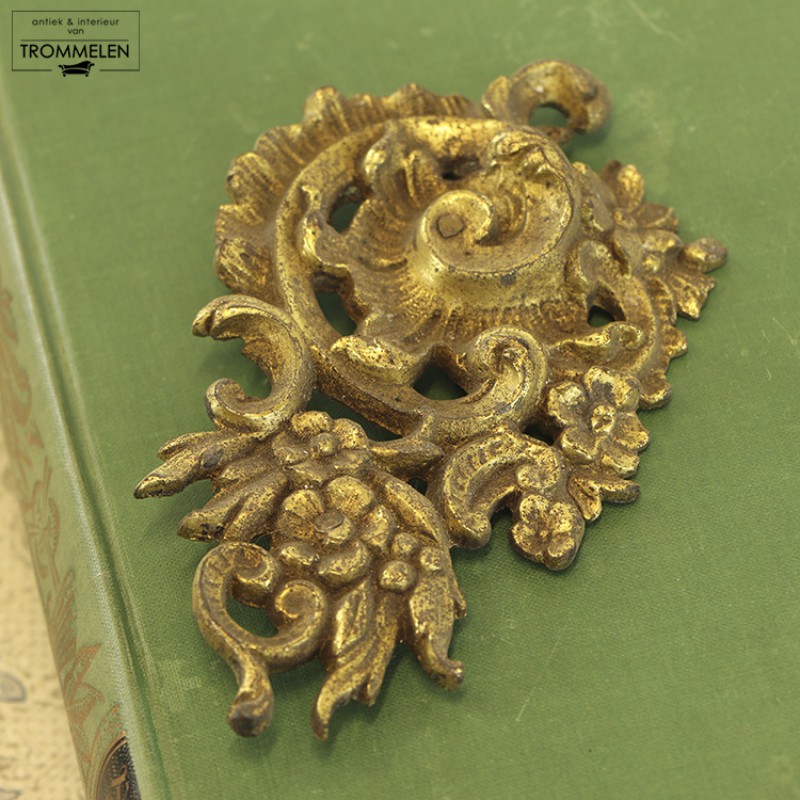 Antiek ornament afkomstig van een schouw. Dit ornament is van messing vervaardigd, in Rococo stijl versierd en verguld. De datering ligt omstreeks 1900.