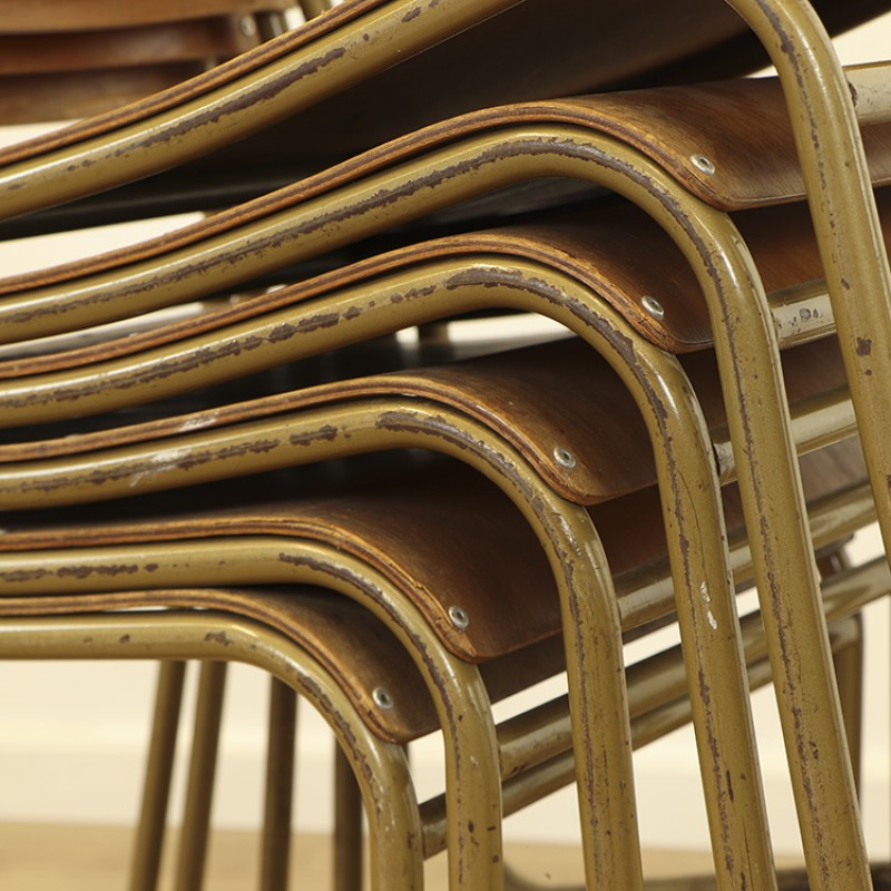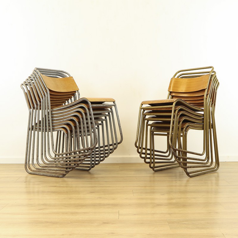 Engelse stapelstoelen van het merk Remploy en Nest-a-Bye. Deze stoelen zijn mooi vormgegeven en licht van gewicht. De stoelen hebben een metalen frame, sommige grijs van kleur andere goudkleurig. De zitting en de rug zijn van triplex. Minimale gebruikers sporen zijn waar te nemen, zo is de verf van de frames wat gesleten en heeft een enkele stoel een hoekje beschadigd op de rug. De stoelen zijn netjes gemerkt aan de achterzijde. Herkomst Engeland, 1950's. Prijs is per stuk, nog 9 stuks op voorraad.