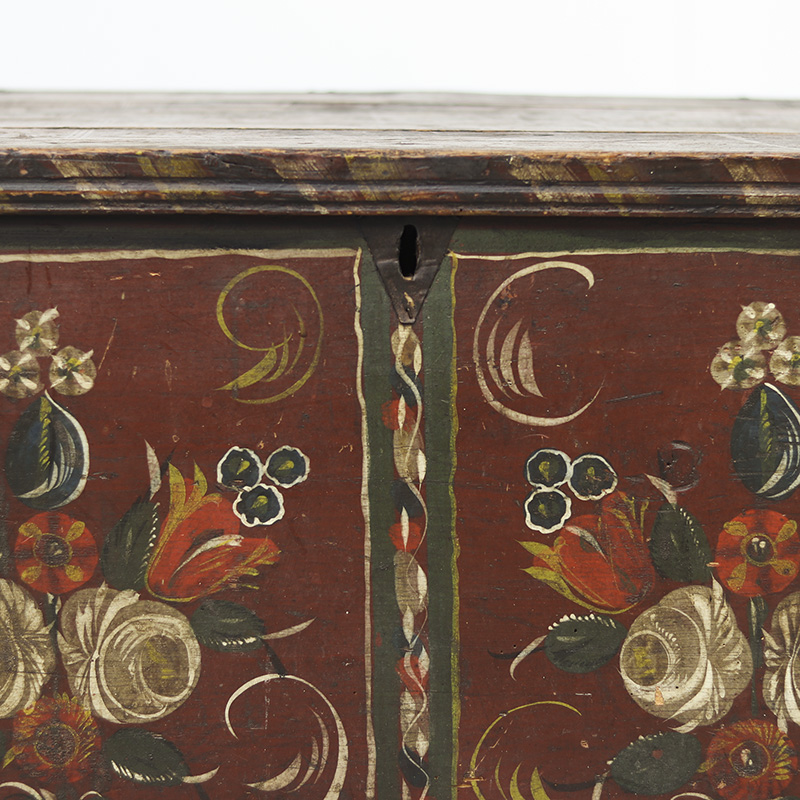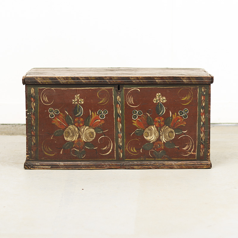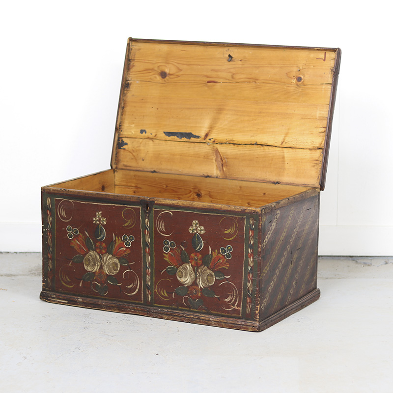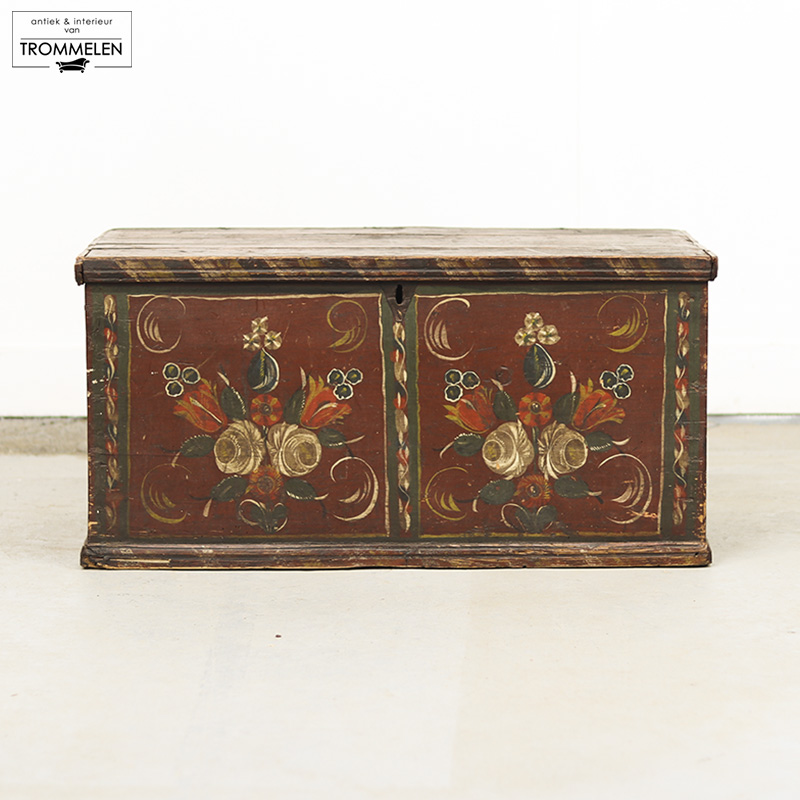 Kleine beschilderde bruidskist uit Oost-Europa. De kist is versierd met prachtige bloemmotieven en dateert omstreeks 1900. Lichte gebruikers sporen zijn waar te nemen, zoals wat lichte beschadigingen op de hoekjes en enkele oude houtworm sporen, die vanzelfsprekend zijn nagelopen en behandeld. Vroeger was het gewoonte om bruidsmeubelen als deze bij een trouwerij cadeau te geven aan het echtpaar. Deze meubelen werden naderhand op de boerderij in een pronkkamer geplaatst die enkel zelden gebruikt werd bij hoog bezoek of speciale gelegenheden. Een prachtig en decoratief stuk geschiedenis dus.