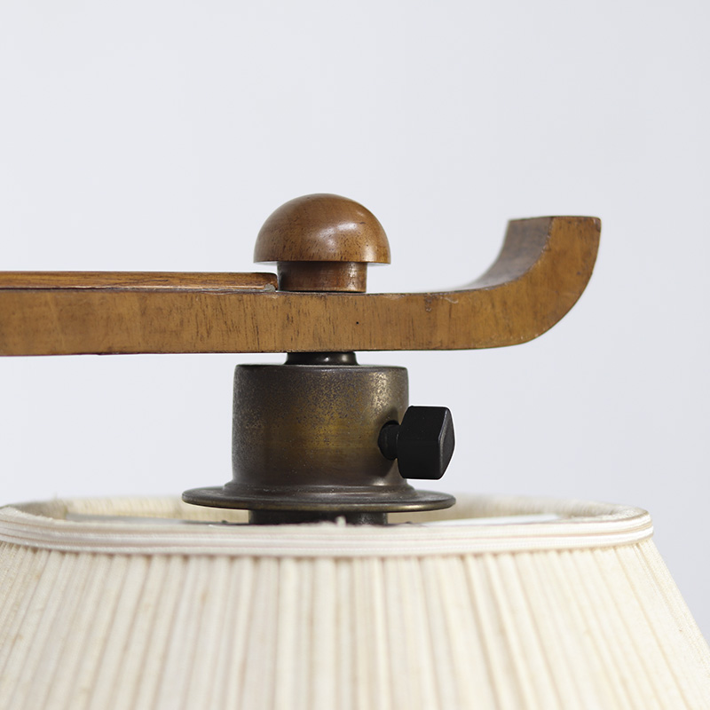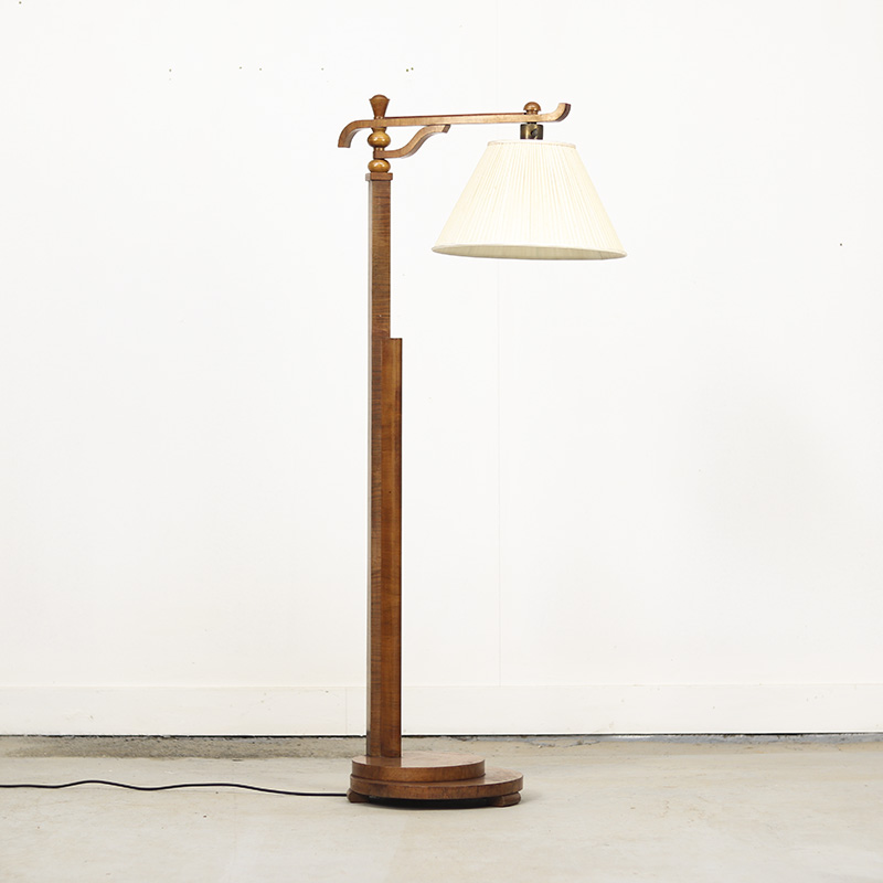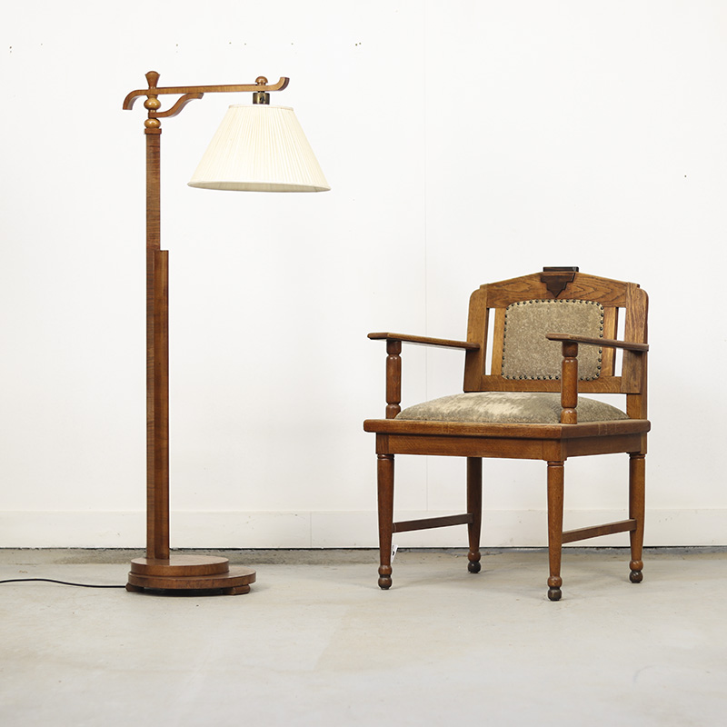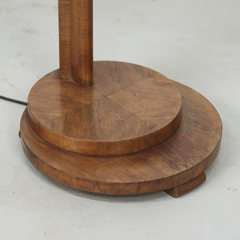 Imposante Art-Deco vloerlamp uit de jaren 1930. Deze lamp is met mahonie fineer afgewerkt en heeft een stoffen kap. De kap is verstelbaar en de kaphouder heeft een ingebouwde schakelaar. Het geheel is voorzien van nieuwe bedrading en is klaar voor gebruik. Lichte gebruikers sporen op het fineer zijn waar te nemen, al verkeerd het geheel nog in een nette staat.