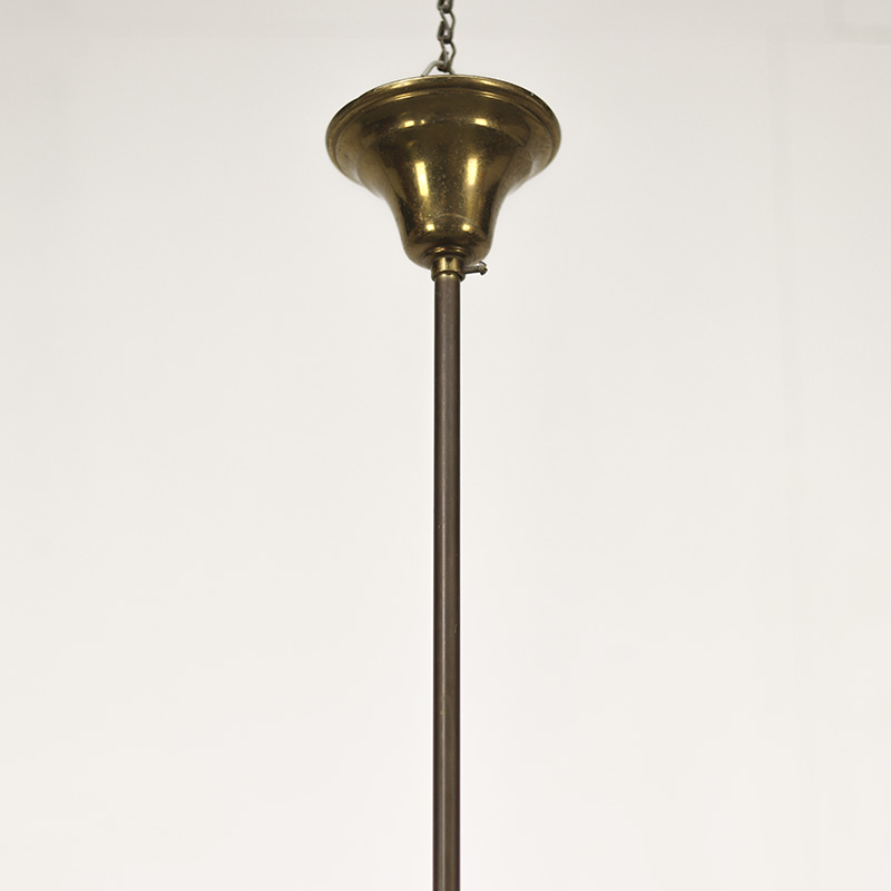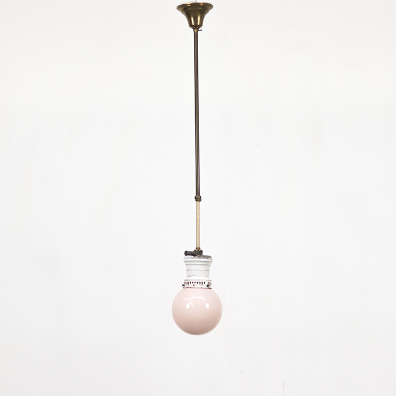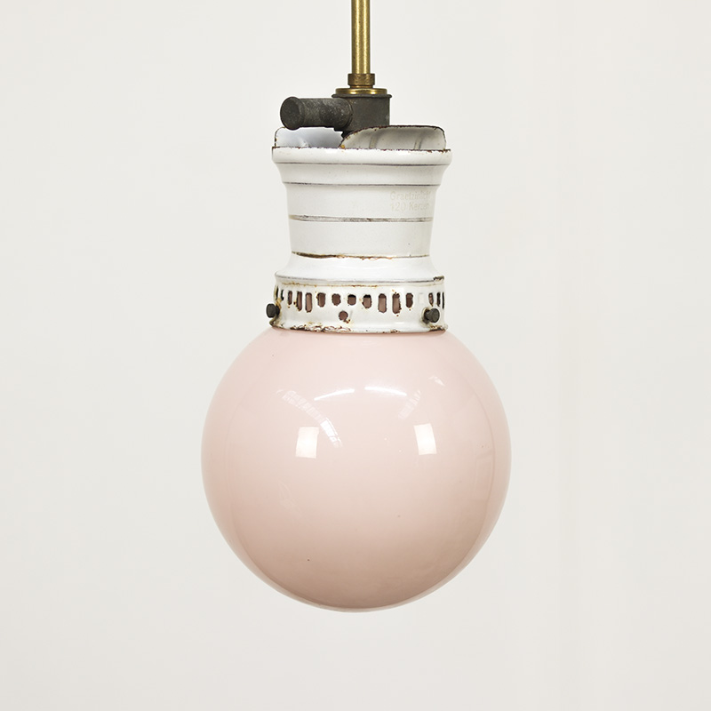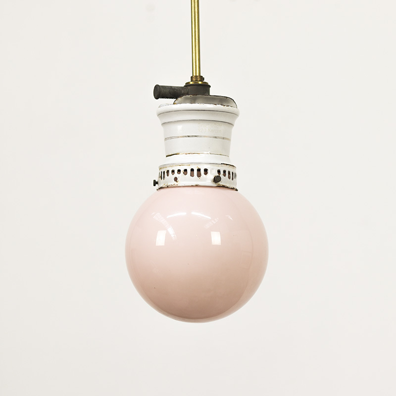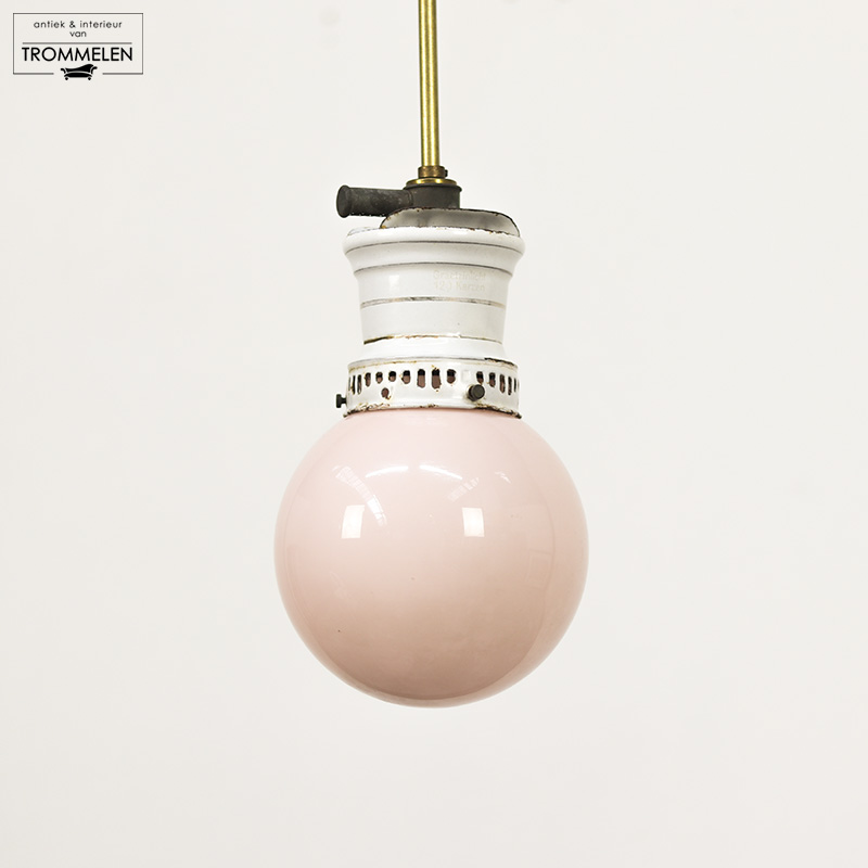 Prachtige Art-Deco hanglamp, welke is omgebouwd van gas naar elektriciteit. Deze lamp heeft een messing armatuur met emaille kaphouder. De lampenkap is van roze gekleurd glas. Het geheel is voorzien van nieuwe bedrading en klaar voor gebruik. De datering ligt om en nabij 1910.