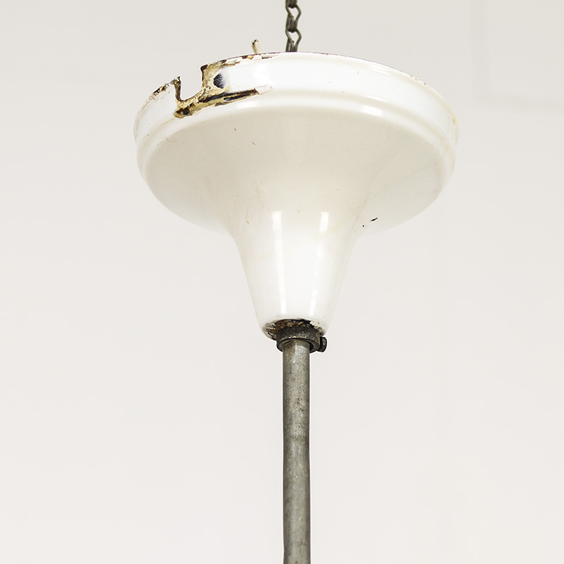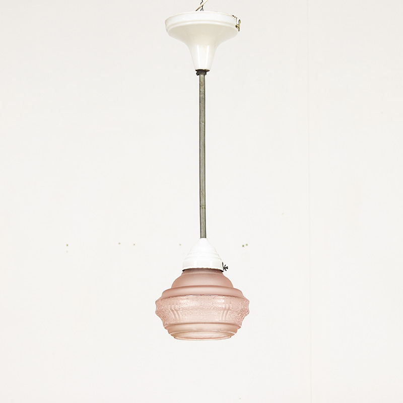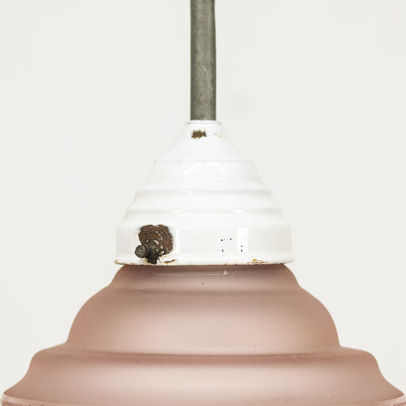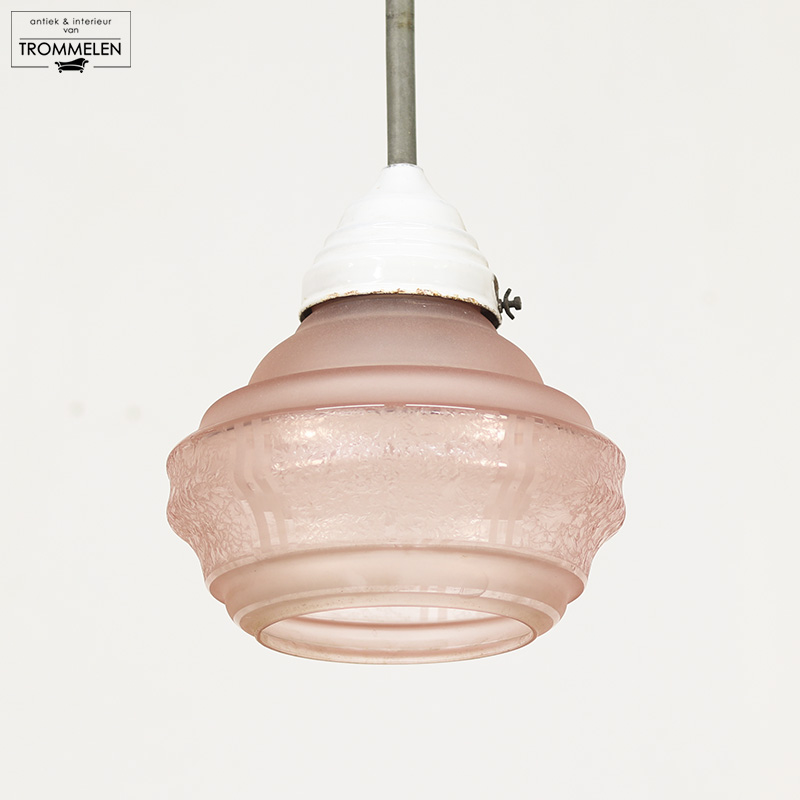 Prachtige Art-Deco hanglamp met roze glas en bijzonder armatuur met emaille kaphouder en plafondkap. De lamp is voorzien van nieuwe bedrading en is klaar voor gebruik. De datering ligt in de jaren 1920.