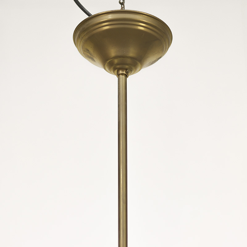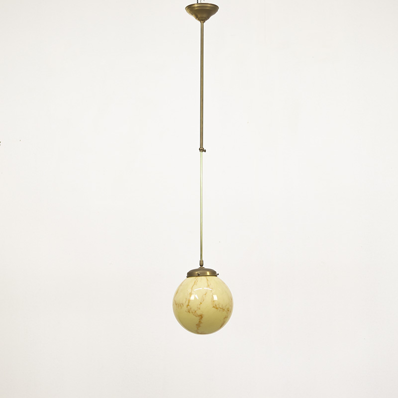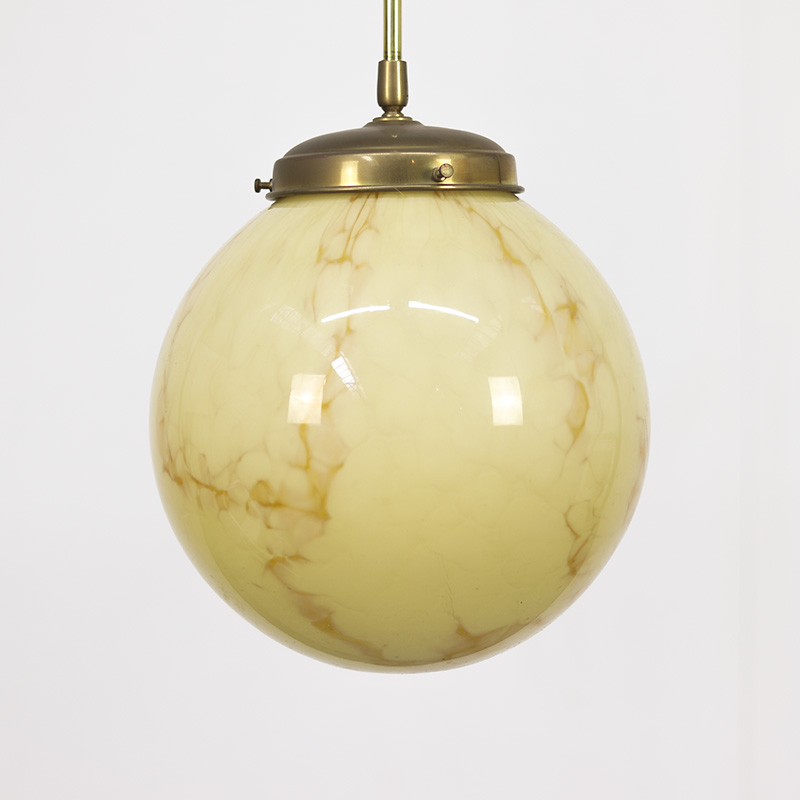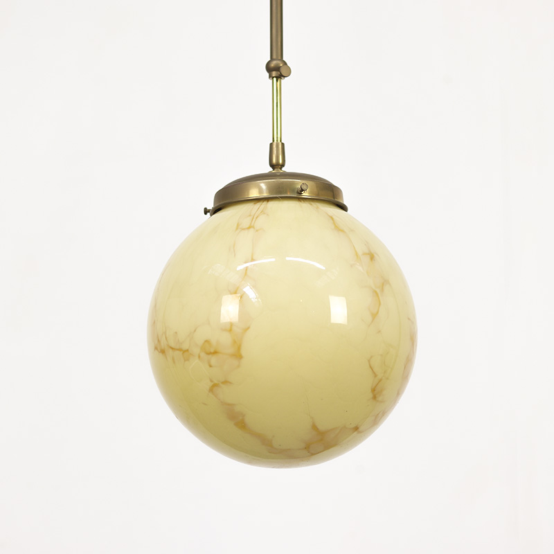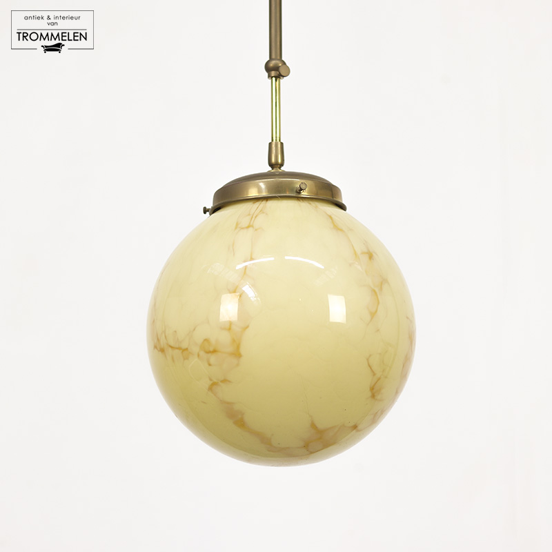 Decoratieve hanglamp in Art-Deco stijl doch vervaardigd in de jaren 1980. De lamp heeft een prachtig messing armatuur wat in lengte te verstellen is. En een glazen kap met uiterst decoratief marmer motief. De lamp is voorzien van nieuwe bedrading en klaar voor gebruik.