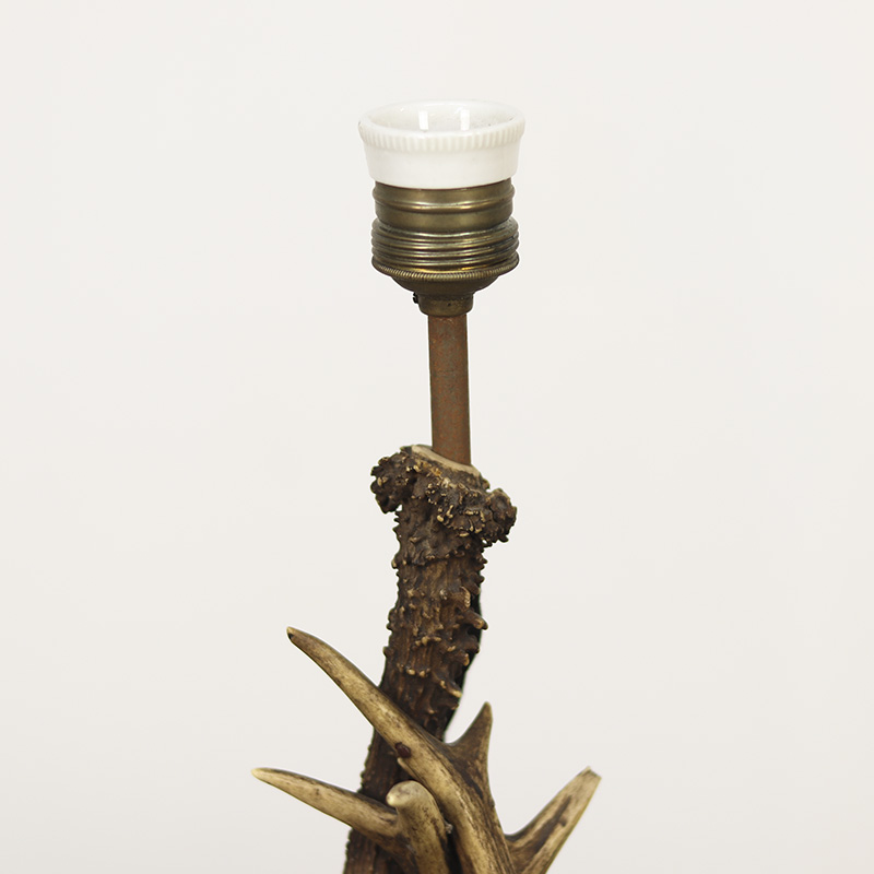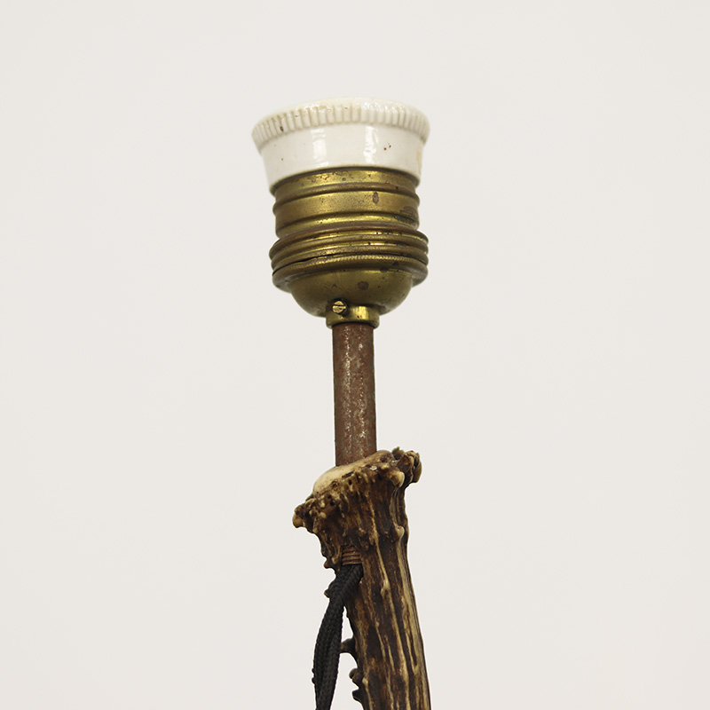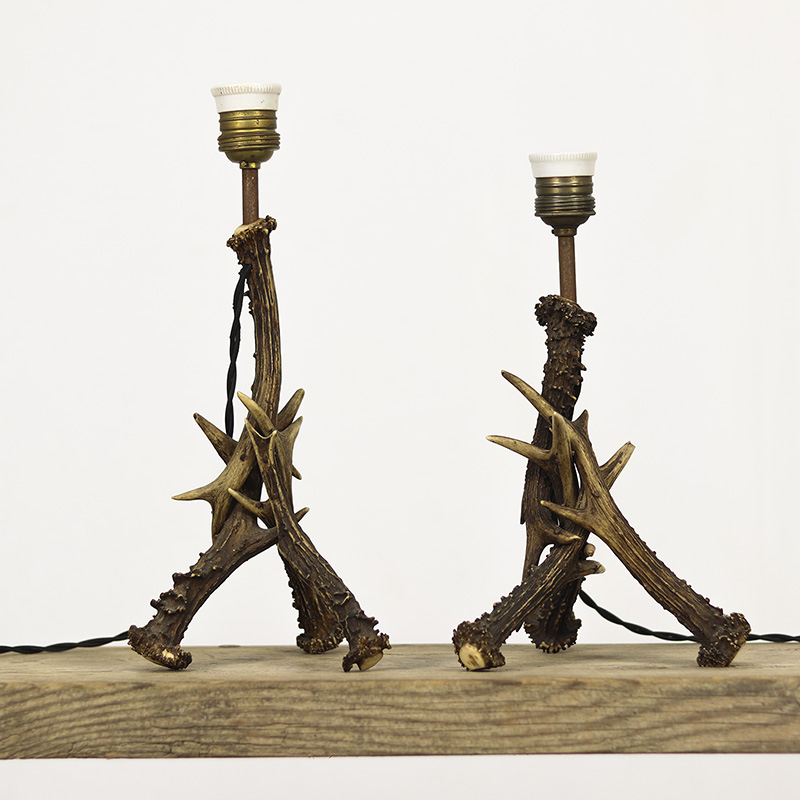 Unieke set tafellampjes in volkskunststijl, vervaardigd uit natuurlijke geweien. Deze bijzondere decoratieve lampen hebben een rustiek karakter en vormen een sfeervolle blikvanger in elk interieur. De lampen dateren uit circa 1960 en zijn volledig voorzien van nieuwe stoffen bedrading, inclusief schakelaar en stekker, waardoor ze direct te gebruiken zijn.