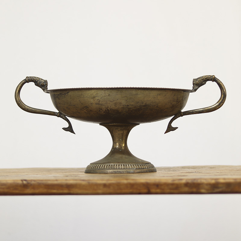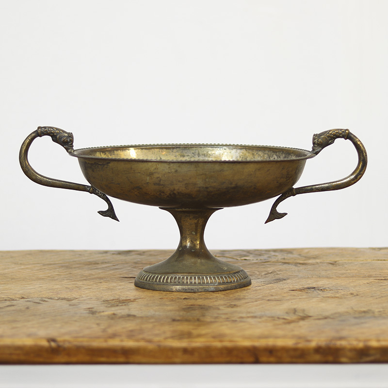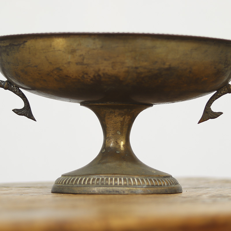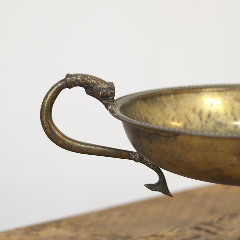 Antieke Italiaanse fruit of serveerschaal uit de late 19e eeuw, vervaardigd van verzilverd messing met decoratieve vissen als handgrepen. De zwaar gepatineerde afwerking geeft dit stuk een unieke, doorleefde uitstraling en karakter.