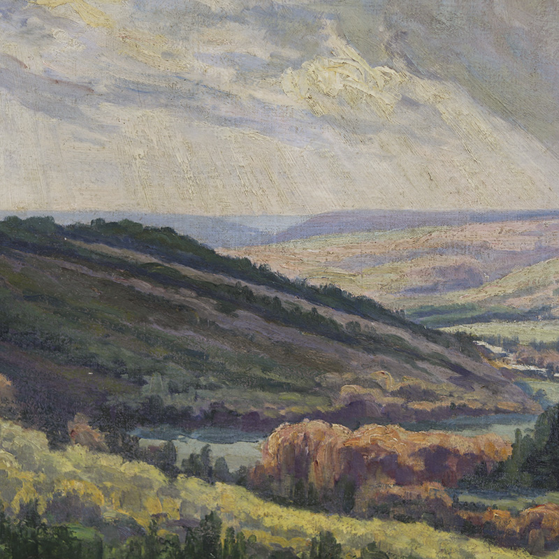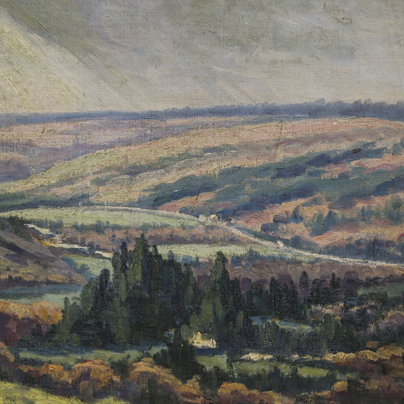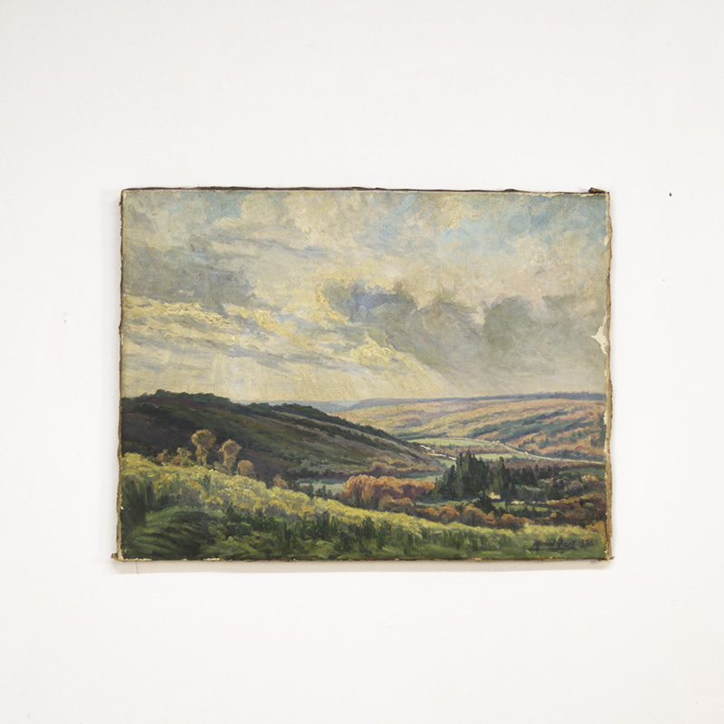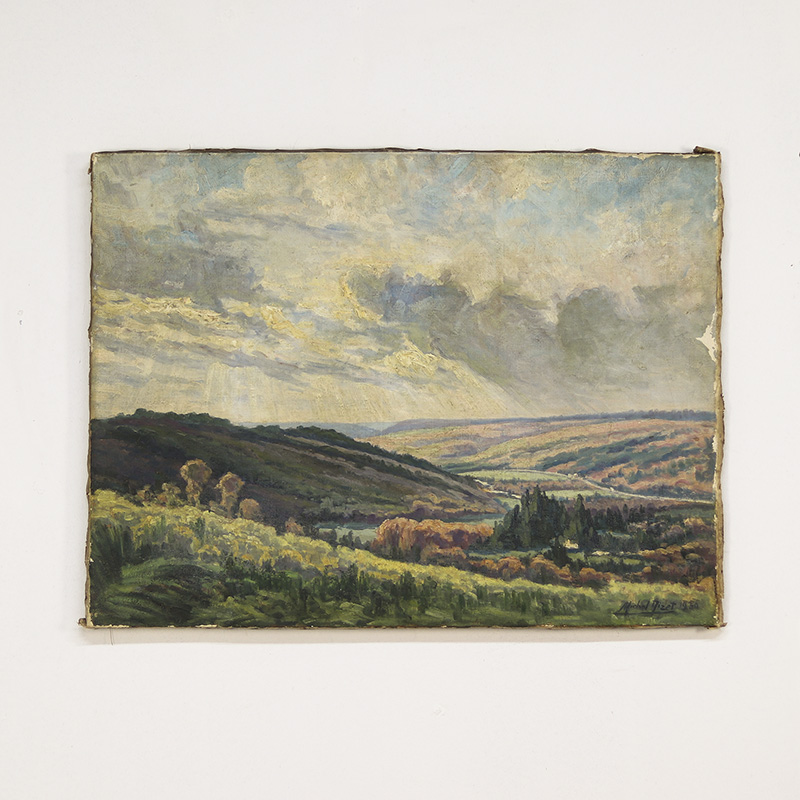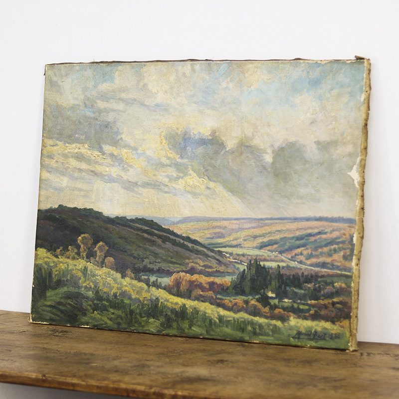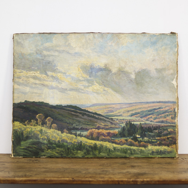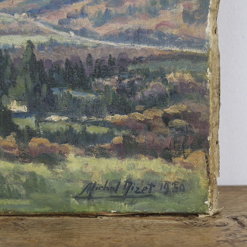 Uiterst decoratief en karaktervol schilderij van Michel Nizet, geschilderd in 1930 in de typische stijl van de Luikse School. Dit olieverf op doek toont een sfeervol Ardens landschap in zachte pastelkleuren, om precies te zijn de streek rond Vielsalm, waar het doek ook door ons werd aangekocht. Zichtbare slijtage en oude gebruikerssporen geven het werk zijn authentieke charme en karakter. Een prachtig voorbeeld van vroeg 20e eeuwse Belgische schilderkunst en het sfeervolle Ardennenlandschap.