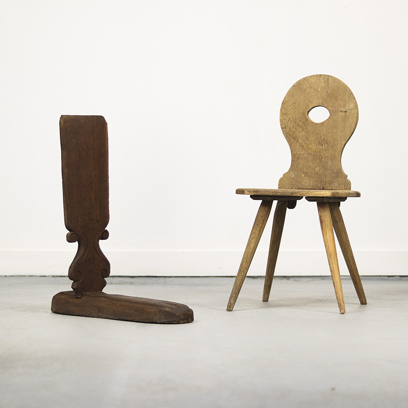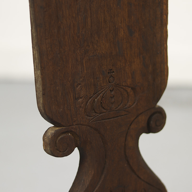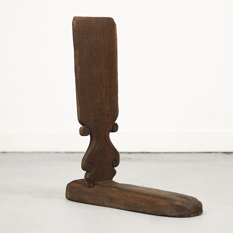 Bijzondere antieke schwingstock uit 1839, gebruikt bij de traditionele verwerking van vlas. Dit originele boerenwerktuig is vervaardigd uit massief eikenhout en draagt zowel de initialen van de oorspronkelijke eigenaar als de vervaardigingsdatum. Afkomstig uit Zuid-Duitsland (Franken). De ornamentale vormgeving, historie en warme patina maken dit tot een zeer karaktervol en decoratief object.