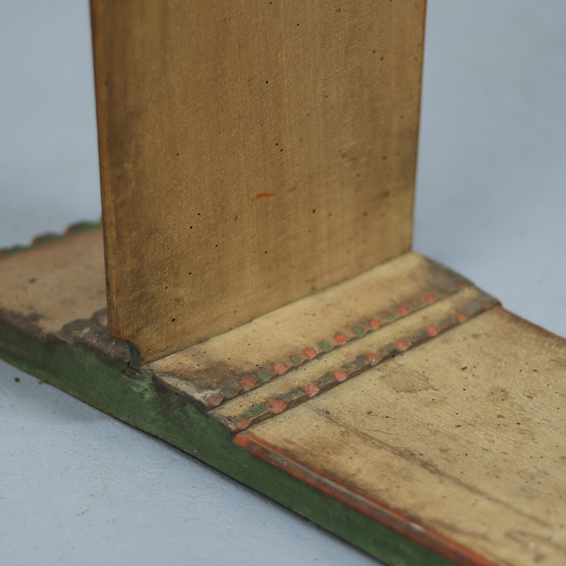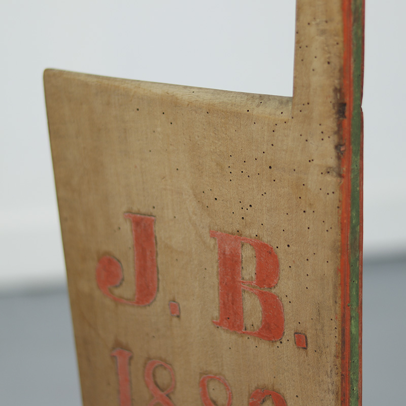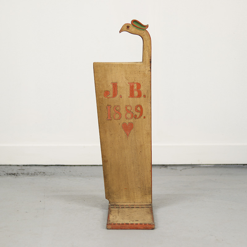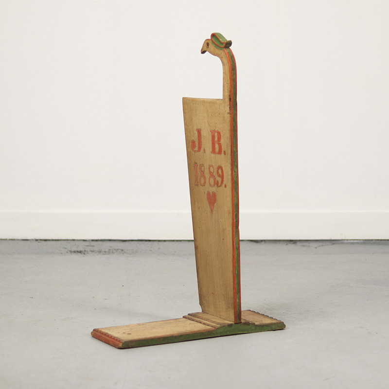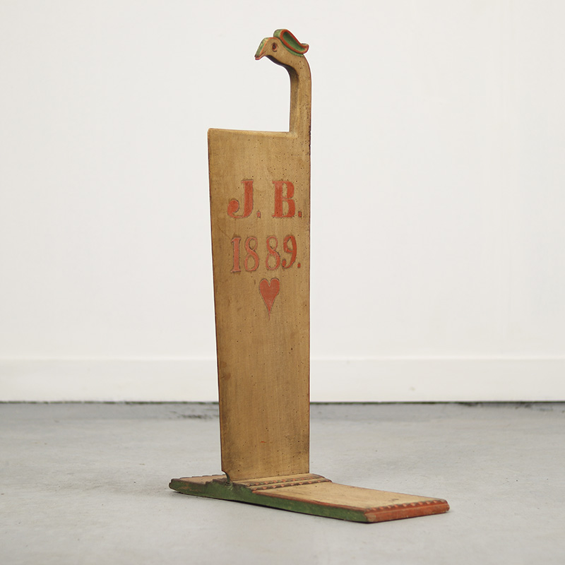 Bijzondere antieke schwingstock uit 1832, gebruikt bij de traditionele verwerking van vlas. Dit originele boerenwerktuig is vervaardigd uit grenenhout en draagt zowel de initialen van de oorspronkelijke eigenaar als de vervaardigingsdatum. Afkomstig uit Zuid-Duitsland (Franken). De ornamentale vormgeving, historie en warme patina maken dit tot een zeer karaktervol en decoratief object. Oude, sporadisch aanwezige houtworm sporen zijn zorgvuldig nagelopen en behandeld.