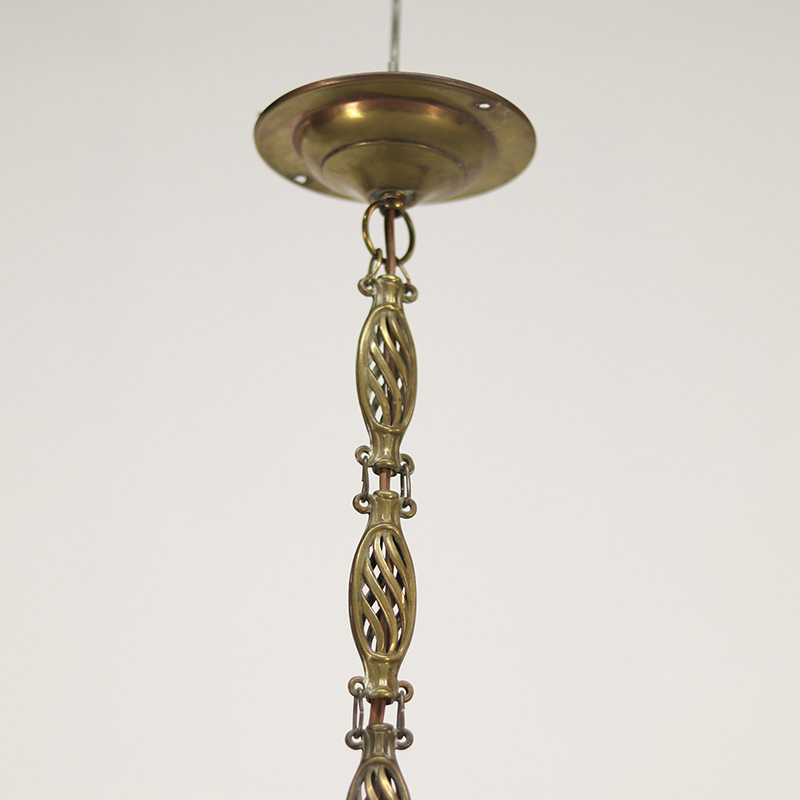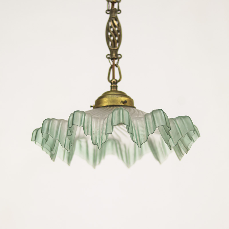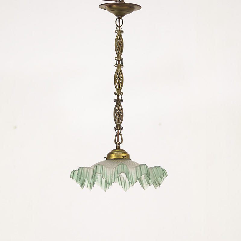 Bijzondere zogenaamde Piecrust hanglamp uit Frankrijk, daterend uit de jaren 1930. De lampenkap is rijk en decoratief vormgegeven en afgewerkt met een groene rand. Het armatuur is vervaardigd uit messing en voorzien van een sierlijke ketting waarin de bedrading subtiel is weggewerkt. De lamp is voorzien van nieuwe bedrading en is klaar voor gebruik.