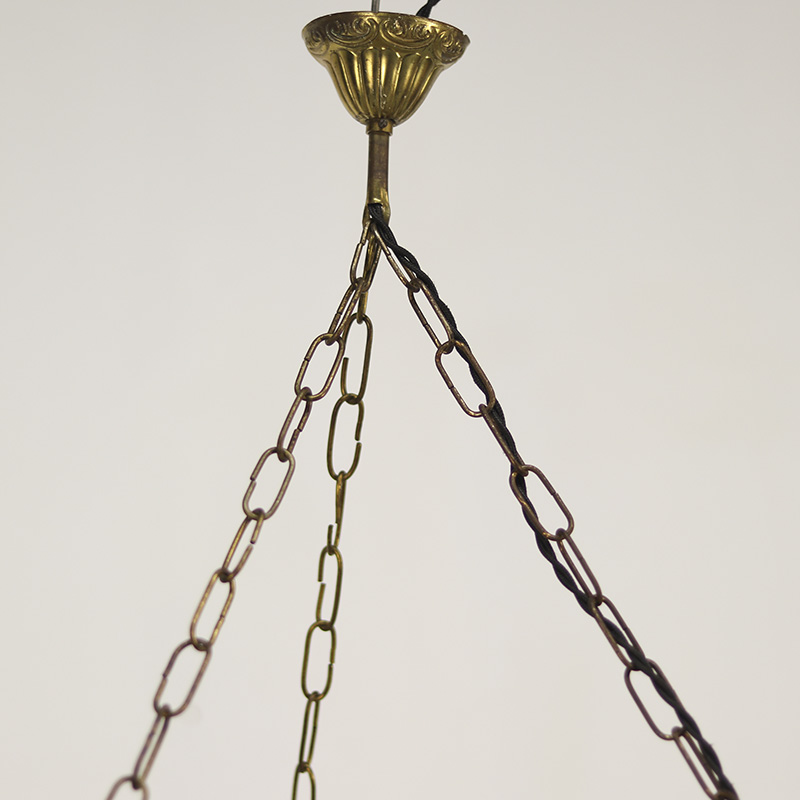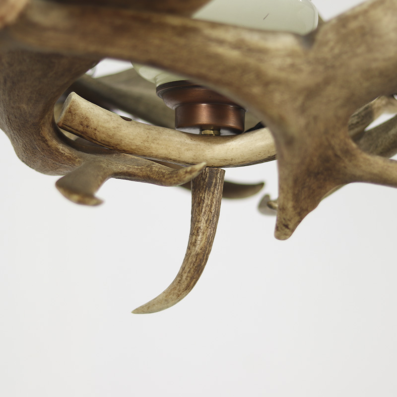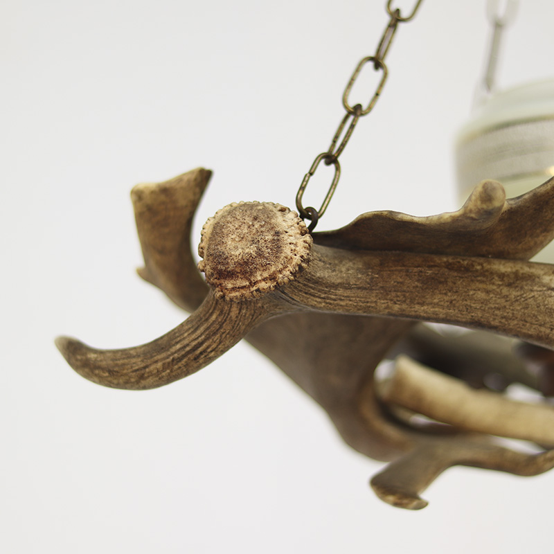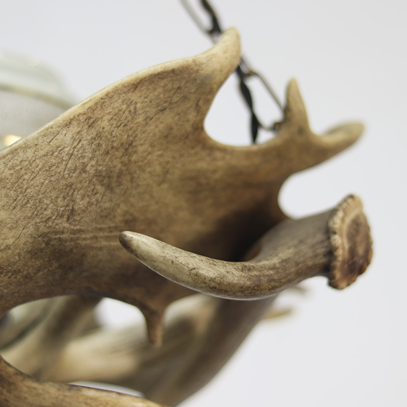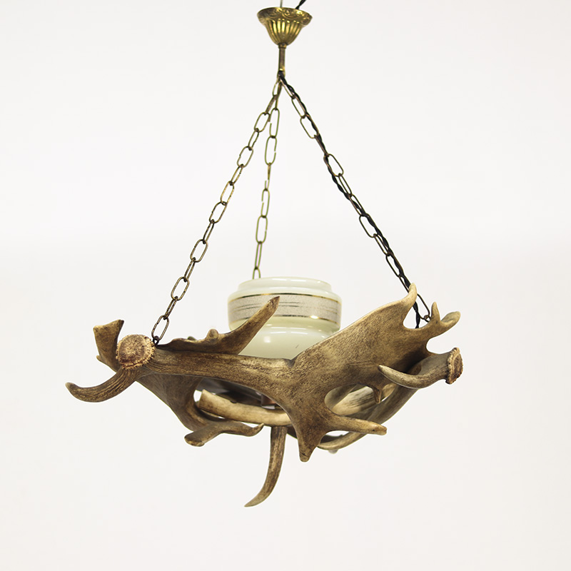 Grote en indrukwekkende kroonluchter welke is gemaakt van echte geweien. De lamp heeft in het midden een lichtpunt welke is voorzien van een lichtgroene glazen kap. De kroonluchter is voorzien van nieuwe bedrading en is klaar voor gebruik. De datering ligt om en nabij in de jaren 1960/1970.