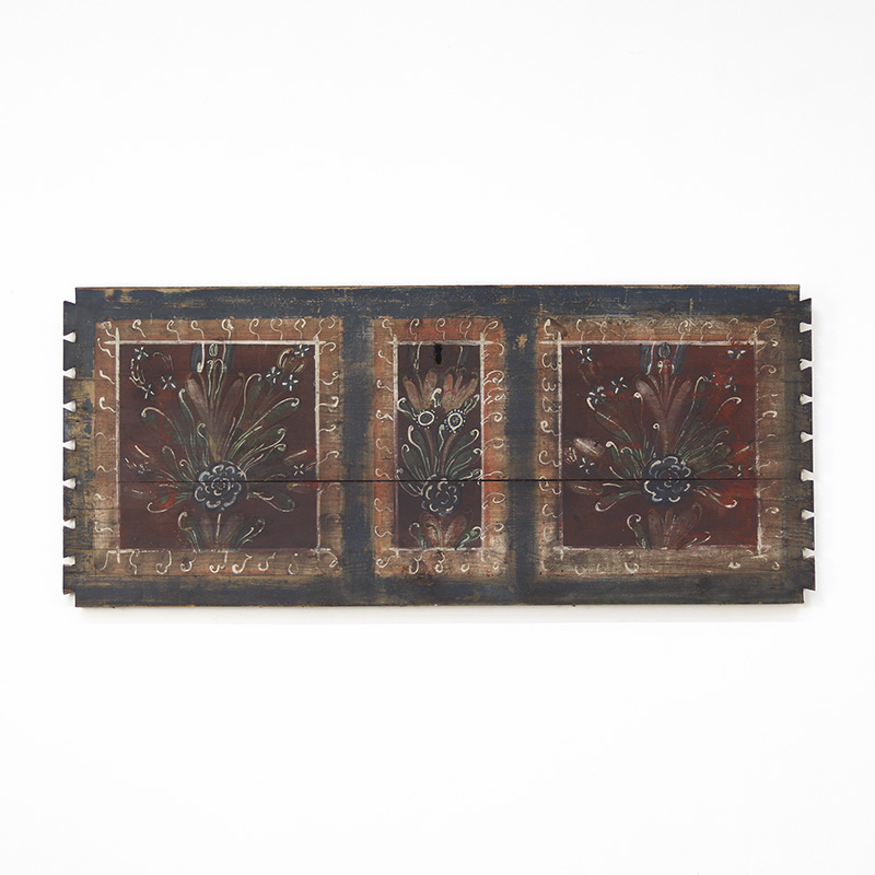 Gerecupereerde voorzijde van een bruidskist, daterend omstreeks 1825 en afkomstig uit Franken, Zuid-Duitsland. Het oorspronkelijke meubel was niet meer te redden, maar dit rijk beschilderde front is behouden gebleven en zorgvuldig getransformeerd tot een kunstzinnig wandobject.