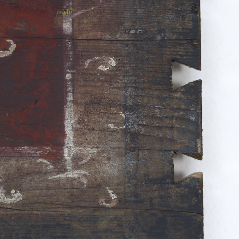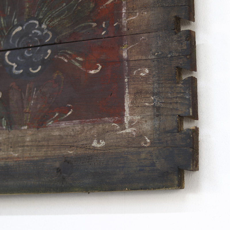 Het paneel is uitgevoerd in een typische volkskunststijl, met florale versieringen en uitgesproken, decoratieve kleuren. De originele verf vertoont een zwaar doorleefde en karakteristieke slijtage, juist deze sporen van gebruik geven het object zijn authentieke en krachtige uitstraling. Het paneel is aan de achterzijde voorzien van twee ogen, waardoor het geheel eenvoudig op te hangen is.