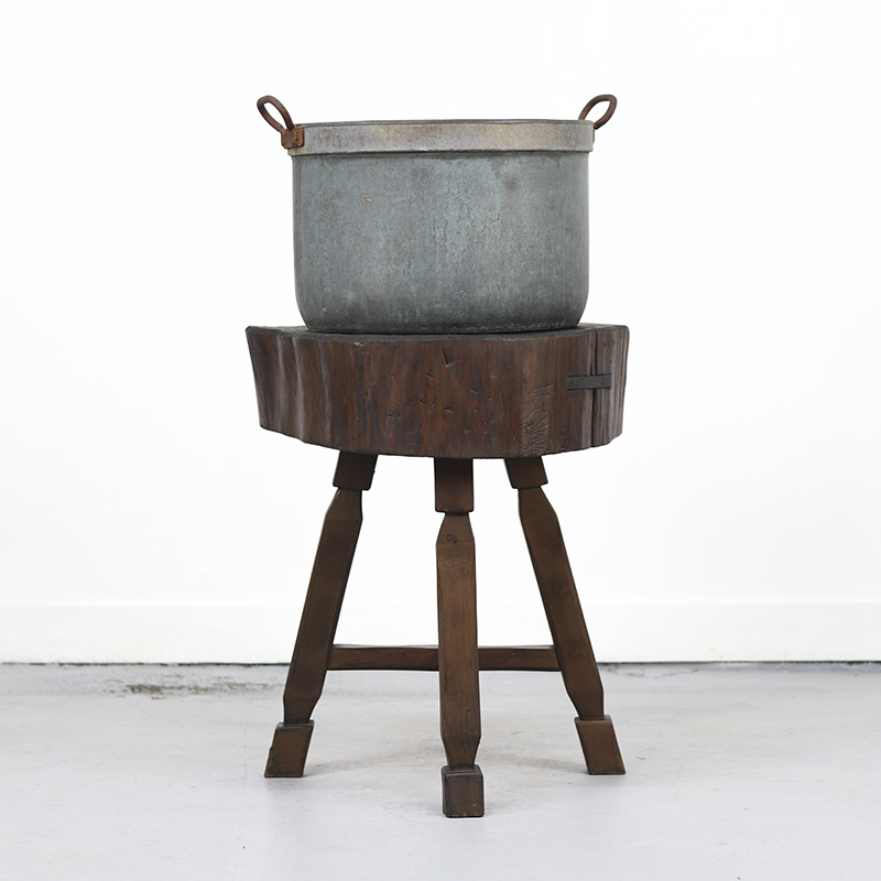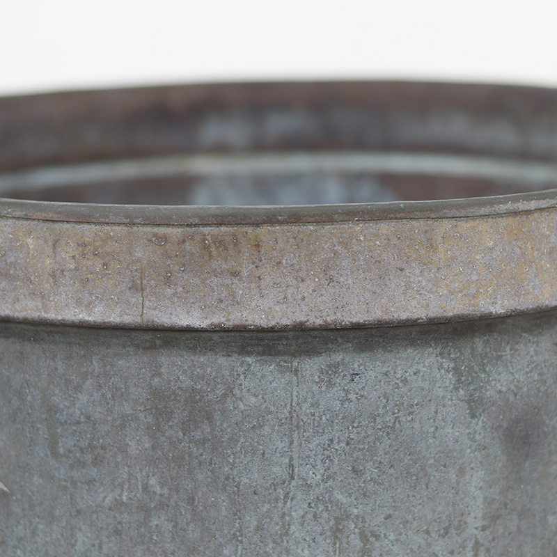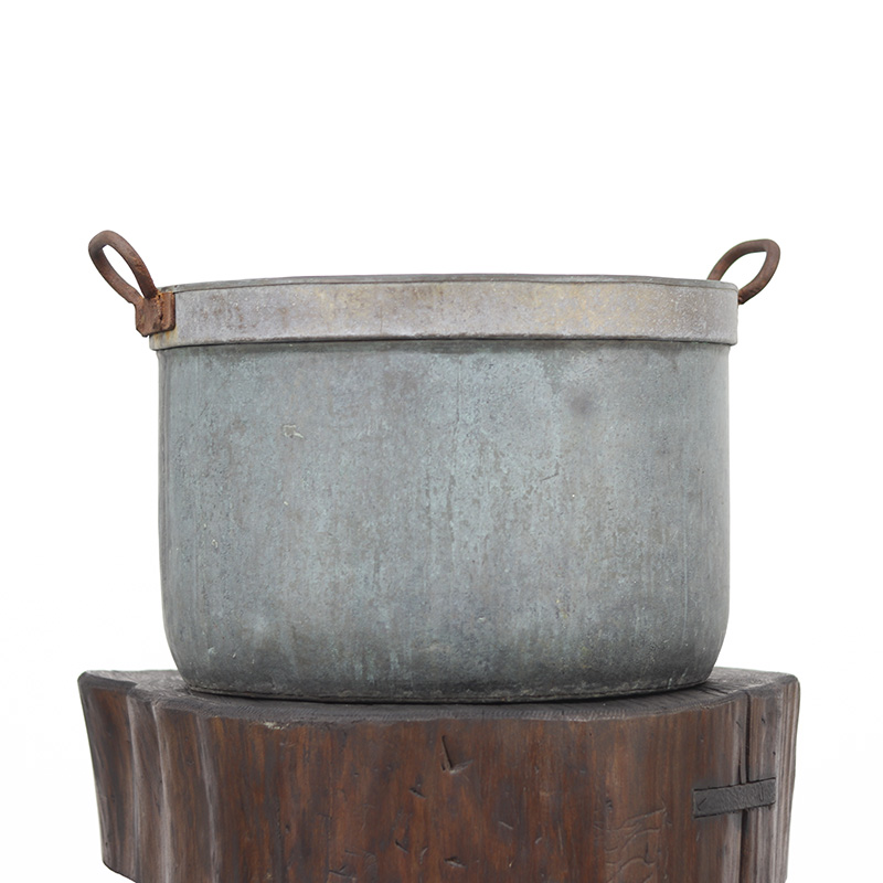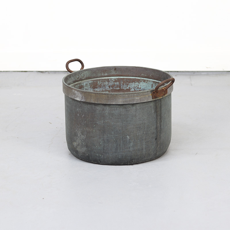 Unieke roodkoperen ketel uit het einde van de 19e eeuw, met een bijzonder sprekend patina in bijna turquoise tint, ontstaan door een eeuw van gebruik. Dit grote exemplaar heeft een prachtige, karaktervolle uitstraling. In goede staat, met enkel lichte roestvorming aan de handgrepen.